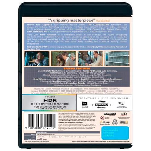 Francis Ford Coppola's intense study of Harry Caul (Gene Hackman), a surveillance expert who tapes a conversation shared by a young couple in San Francisco's Union Square. As Caul comes to believe the recording may lead to their deaths, he begins to question his profession and his own sense of privacy. John Cazale, Allen Garfield, Frederic Forrest, Cindy Williams, Teri Garr, Harrison Ford, and Robert Duvall also star in this stunning Watergate Era effort. 113 min. Widescreen (Enhanced); Soundtrack: English. Region Free