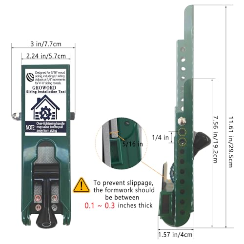 - 【Point of Attention】Siding Tool for 5/16-inch fiber cement siding. Adjusts in 1/4-inch increments for 4- to 8-inch siding reveals. This tool will securely fasten a 12-foot-long piece of pistola de siding with hands-free nailing. This feature ensures perfect equal spacing between each board. Do not over-tighten the handle; over-tightening the handle may cause the tool to disengage from the siding.