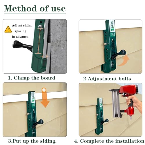 - 【Simple to use】This siding installation tools is simple and quick to use when in use. Step 1: Adjust the spacing of the siding installation as needed. Step 2: Slide and clamp the tool onto the first course of siding. Step 3: Place the next course of siding on top of the tool. Step 4: Secure siding with nails and repeat installation steps