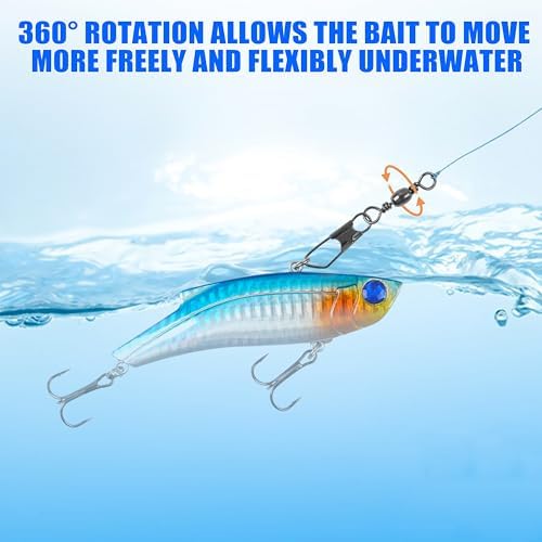 - 【Flexible Rotating】Even under pressure, the barrel swivel snap rotates smoothly underwater at a high speed of 360°, allowing the lures to swim more naturally and preventing line twisting