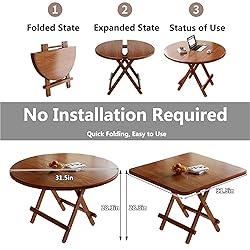 Round Folding Dining Table: The rich brown finish of this dinner table enhances its visual appeal. The classic round tabletop design combined with the sturdy X-shaped base creates a warm and welcoming atmosphere for gatherings with family and friends Durable And Sturdy: Crafted from high-quality thick wood, the rustic round kitchen table has durability and sturdiness. The solid construction ensures that it will withstand daily use and remain in excellent condition for years to come. The surface is waterproof, scratch-proof, and easy to clean A Great Space Saver: This drop-leaf dining table is making reasonable use of limited space. When you don't use the folding kitchen table, You could fold it up completely and put it in a corner so it doesn't take up too much space, which is excellent for small spaces like small apartments. 31.5" × 29.5" Practical and Multi-Purpose:This small kitchen table is not only a functional piece of furniture but also a stylish addition to your home decor. The dinner table's practical design allows it to be used for various purposes, such as a study or work table, or even as a centerpiece for your living room No installation required: This modern dining table does not require any assembly. You can get a complete dining table immediately and start enjoying your meals. Its durable construction promises to withstand the test of time, offering a stable platform for meals, gatherings, and more
