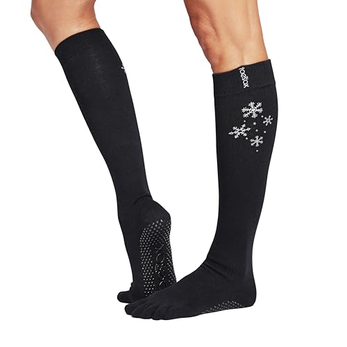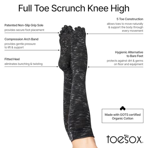 - NON-SLIP GRIP SOLE: The hygienic alternative to bare feet, these toe socks have a patented non-slip grip sole great for studio activities and secure foot placement. The ribbed knee-high build comfortably fits at the knee or scrunched around the calf.