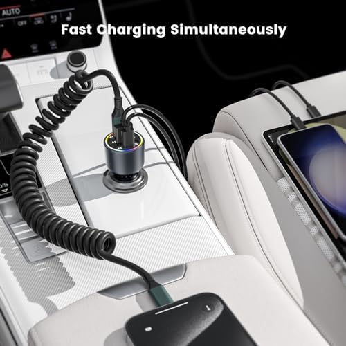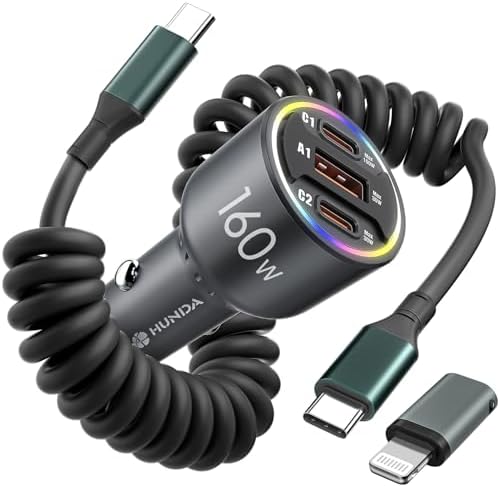 - [Extra 100W Coiled Data Cable and C-Lightning Converter] 2025 new upgraded dual usb car iphone charger not only comes with a 100W USB C to USB C coiled data cable for iPhone 16 series that supports PD and QC fast charging, but also adds a C-Lightning converter for fast charging and data transfer for all Lightning devices.