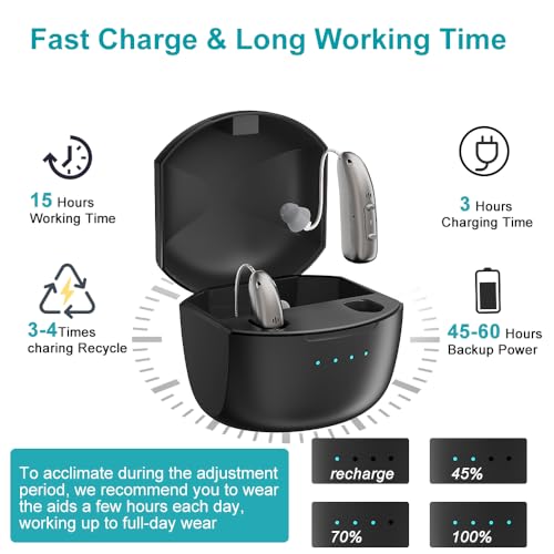 - Hearing aids Rechargeable: It is a USB rechargeable hearing aids that can be placed in the base for wireless charging without frequent battery replacement. The hearing aid for the elderly can be charged quickly for 2-3 hours and work for up to 15 hours. It is a perfect all-day hearing aid