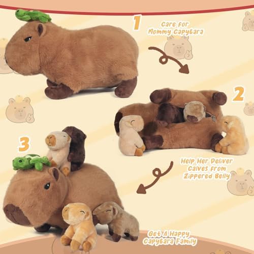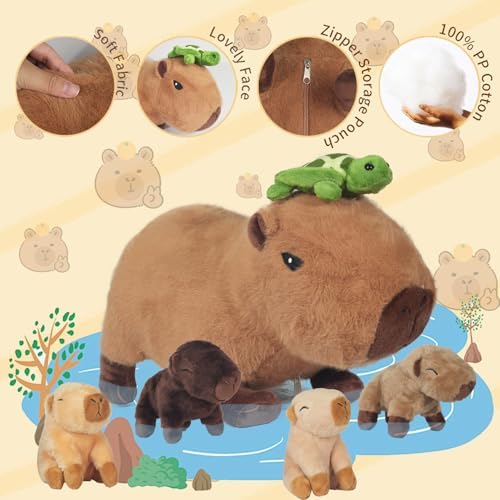- 【Capybara Plush Toy Sets】Meet our cute 5 in 1 capybara stuffed animal with babies set, including 14.2 inches mommy capybara with turtle over head, and 4 * 4.72 inches baby capybara plushy toys in different styles; crafted from high quality plush fabric and filled with soft cotton, providing kids with a sense of security and comfort. Whether playing alone or with friends, kids can create various interesting game scenarios with this the mommy and baby capybaras set, bringing endless joy to their childhood