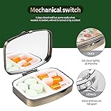 Pill case Dimensions: 2.2 x 1.8x 0.6 inches. The divider in the middle can be taken out, so it turns into a single compartment. Material: Metals, Glass. Compact & Portable Design: Crafted from durable yet lightweight metal, our rectangular pill case slips seamlessly into any pocket or purse, making it the ideal choice for on-the-go medication management. Secure Mechanical Locking System: The smart design ensures your pills remain safely enclosed, while still providing quick and easy access when you need them, preventing accidental openings during transport. Versatile Storage Options: Featuring two compartments for organizing different medications,a removable divider for customized storage, it adapts to meet your unique needs whether you're sorting pills or storing other small items. Rugged Durability: Built to last, our pill box withstands the rigors of daily use, offering a reliable solution for medication organization that won't let you down even in tough conditions.