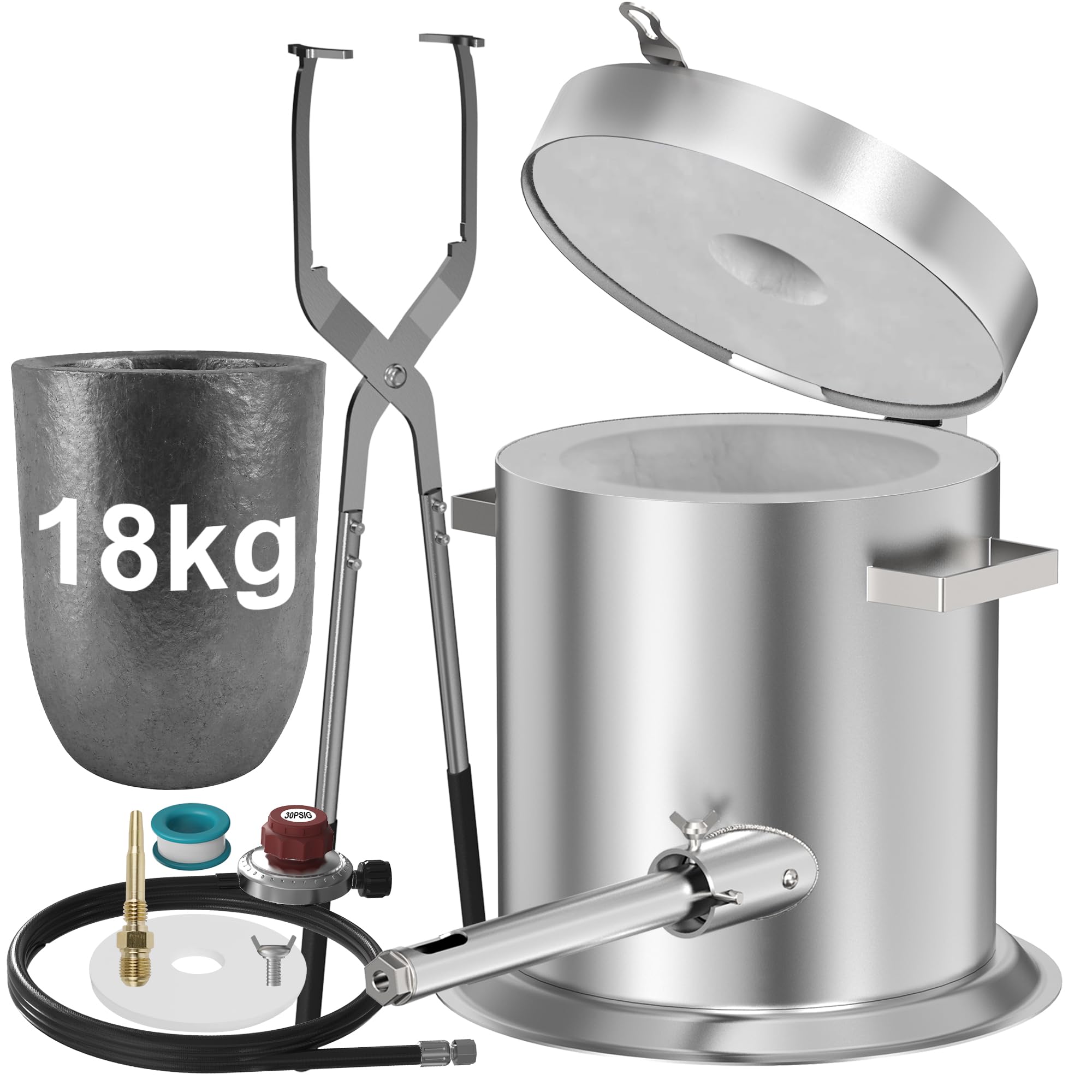 - Furnace Kit List: melting furnace kit with furnace, crucible, bag, goggles, gloves, tongs, pouring tongs, burner, fire bricks, ingot mold, gas hose with regulator, brass torch, PTFE tape, Instruction manual
