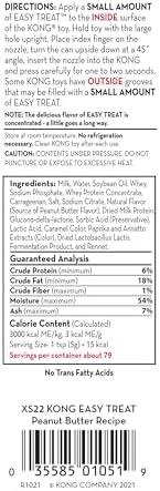 KONG Peanut Butter Easy Treat is a delicious treat that delights all types of dogs while providing an easy no-mess solution for pet parents. Made in the USA, this highly-digestible and trans-fat free treat is an enticingly delicious addition when added to a stuffed KONG. A uniquely designed nozzle easily controls the amount of KONG Easy Treat while also having the added benefit of a convenient, no mess stuffing solution. Want to make your stuffed KONG last longer? Freeze a stuffed KONG, topped with KONG Peanut Butter Easy Treat for a longer-lasting, mind occupying challenge. No Refrigeration required.