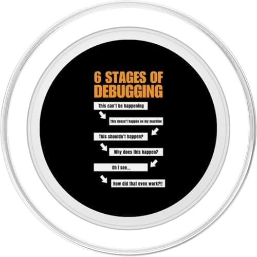 - Navigate the emotional rollercoaster of debugging with our "6 Stages of Debugging" design. It humorously captures the common reactions programmers have when confronted with baffling code behavior.