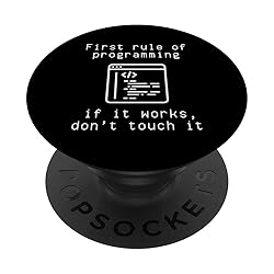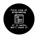 Celebrate the golden rule of coding with our "First Rule of Programming" design. It humorously highlights the well-known coder mantra: "If it works, don’t touch it," capturing the essence of programming pragmatism. Ideal for software engineers, developers, and anyone who's ever regretted tweaking functioning code. This piece serves as both a funny reminder and a wise warning, perfect for office attire or as a present for the tech-savvy individual in your life. Adhesive backing attaches the PopGrip to your case or device. Will not stick to silicone, leather, waterproof, or highly textured cases. Works best with smooth, hard, plastic cases. Not compatible with wireless charging Printed top is swappable with other compatible PopGrip models. Just press flat, turn 90 degrees until you hear a click and remove to swap.