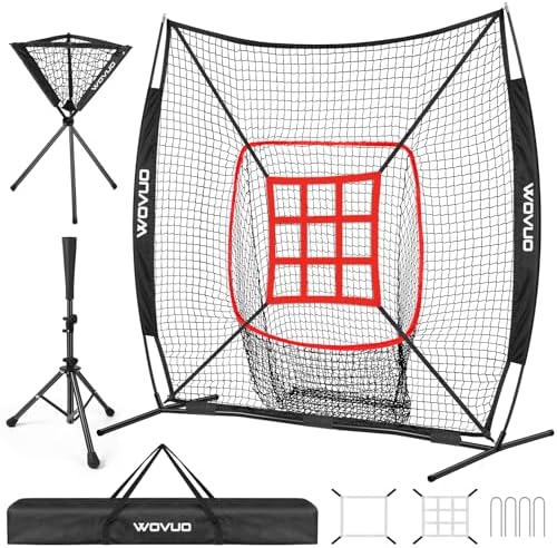 - COMPLETE AND VALUABLE BASEBALL NET SET: The softball pitching net set is a top-quality baseball net set on the market. Includes a 7×7ft baseball net for batting and pitching, adjustable baseball tee for hitting, 1* baseball caddy, 2 strike zone targets, 4 ground stakes, and a portable softball net bag. The baseball training equipment is for players of all ages or skill levels. Perfect for home practice, team training, batting cages for backyard and youth leagues.