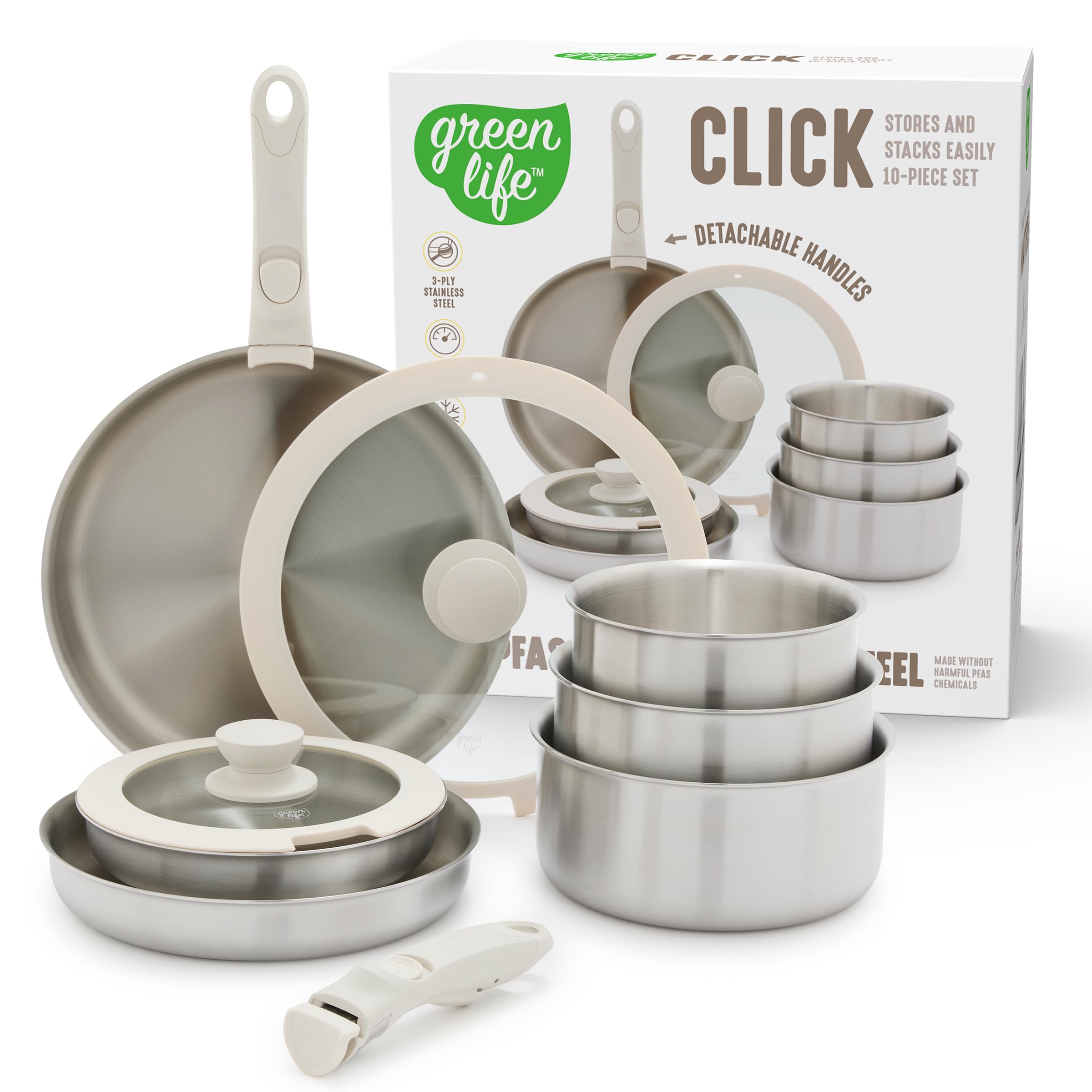 GreenLife Stainless Steel Nonstick 10 Piece Cookware Set, Detachable Handle, Induction Ready, Stackable Kitchen Set, Tri Ply Ceramic PFAS Free Pots & Pans, Space Saving, Oven Safe, Glass Lid, Silver