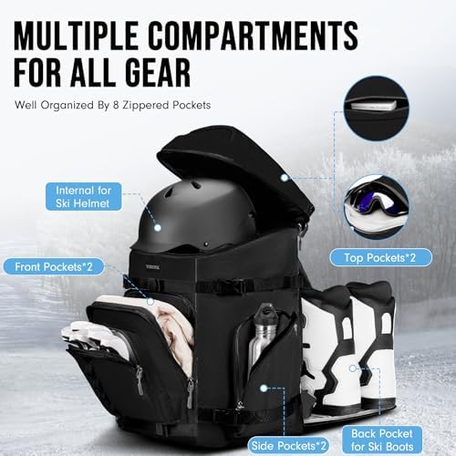 YOREPEK 65L Ski Boot Bag Backpack with 8 Pockets, Waterproof Ski Snowboard Boot Bags for Air Travel, Ski Gear Bag Backpacks for Boots, Helmet, Goggle, Gloves, Pants, Jacket, Accessories for Adults