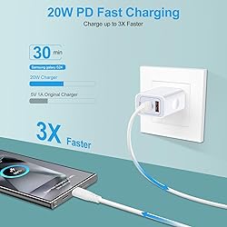 - Description : Super Fast Charging: Equipped with an USB Type C port, PD 3.0 charger provides you Max 20W output power, fast charge your battery from zero up to 100% in about 60 Mins, 3 times as fast as Standard Wall Charger Safety & Durability Our c type charging box is certified with CE, FCC and PSE, endurable and safety. Travel Ready: Compact 20W USB C wall charger and eay to carrry. Perfect for travel Specifications: 20W Super Fast Charger Input Voltage: 100-240V ~ 50/60Hz, 0.7A Output Power: USB-C:5.0V/3.0A, 9.0V/2.75A PPS:3.3-5.9V/3.0A 3.3-11.0V/2.25A Output Power: USB-A:5.0V/3.0A, 9.0V/2.0A ,12V/1.5A USB-C & USB-A:5.0V/3.0A (15.0W MAX) Compatibility List: Google Pixel 9/9 Pro XL/9 Pro/9 Pro Fold/8 Pro /7a/7/7 Pro/6/6A/6 Pro/5/5A/5XL/4/4a/4XL/3XL/3A/2XL/2A/X Samsung Galaxy A15 5G, A14 5G,A25,A24 A54 A34 A04S,A13 A33 5G A23 A32 A53 A73 F23 F52 A02S A03S Samsung Galaxy S23 FE,S23 Ultra,S23+,S22 Plus,S22 Ultra,S21,S21 FE,S10e,S8,S9 S10 S20 Plus,S8 Active Samsung Galaxy Note 20 Ultra,Note 10/9/8,Galaxy A7,A5,A3Samsung Galaxy Z Flip 6 5/4/3,Z Fold 6 5/4/3,A11,A12,A10e,A21, A30,A32,A30s,A40,A42,A40sSamsung Galaxy A53,A50s,A51,A52, F52 5G,A72,A70,A70s,A71 5G,A80,A81,A90,A91 iPhone 15/15 Pro/15 Pro Max/15 Plus/iPhone 14/14 Pro/14 Pro Max/14 Plus/iPhone13/13 Mini/13 Pro/13 Pro Max/iPhone12/12 Mini/12 Pro/12 Pro Max/iPhone 11/11 Pro/11 Pro Max/ iPhone SE/XS/XS Max/XR/X/8 Plus/8 Motorola Edge/G Stylus 5G/G Power 2024 2023 2022, Edge 50 Ultra Pro, X50 Ultra X40, Razr 40 Ultra, Razr 2024-2022 What You Get: (White) 2 x 20w Dual Port A+C type c charger fast charging block