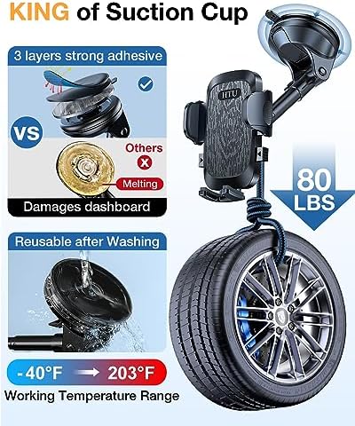 - [Super Suction Cup, Rough Road Friendly] The upgraded suction cup enlarges the base and adjusts the center of gravity, which makes the suction cup more stable and never falls.It adopt 2-level locking mechanism, which is 3 times stronger than ordinary suction! The suction cup is made of 3 layers of nano sticky gel, which can prevents air gaps from forming and can withstand the temperature from -40°F to 203°F. The enhanced suction power is up to 88LBS, it holds heavy phones effortlessly.