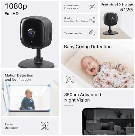 Protect your home with the Tapo C101 smart indoor security camera Wi-Fi. Featuring crystal-clear 1080P high-definition video, it captures every detail inside your home. Receive instant push notifications when motion, a person, or baby crying is detected from this baby camera monitor, all without additional fees. Monitor your home day and night with up to 30ft of night vision using the integrated IR sensor. Utilize the 2-way audio with a built-in siren to use as a pet camera with the phone app and deter intruders. Fully compatible with Amazon Alexa and Google Assistant, simply use voice commands to view the Tapo indoor security camera live stream on Echo Show or Google Chromecast with a screen. Store footage continuously on a microSD card up to 512 GB (not included) or subscribe to Tapo Care for cloud storage, offering a 30-day video history and additional benefits such as motion tracking and baby crying detection. [Before purchasing a microSD card, please check the TP-Link website FAQ to ensure compatibility with your device.]