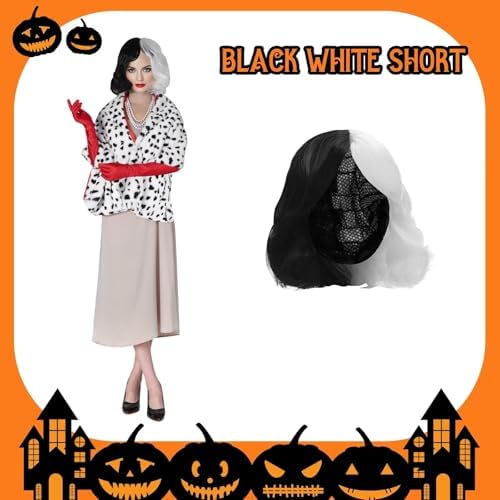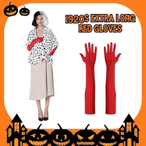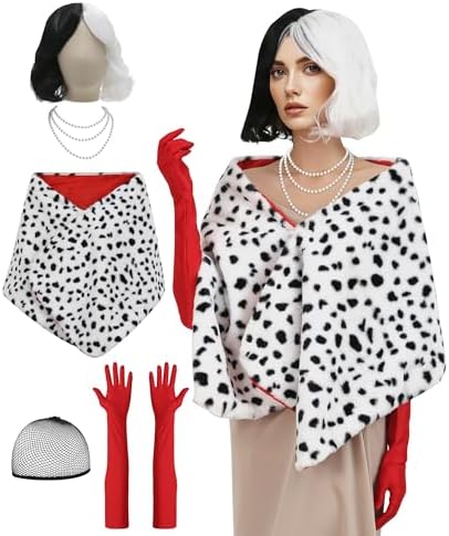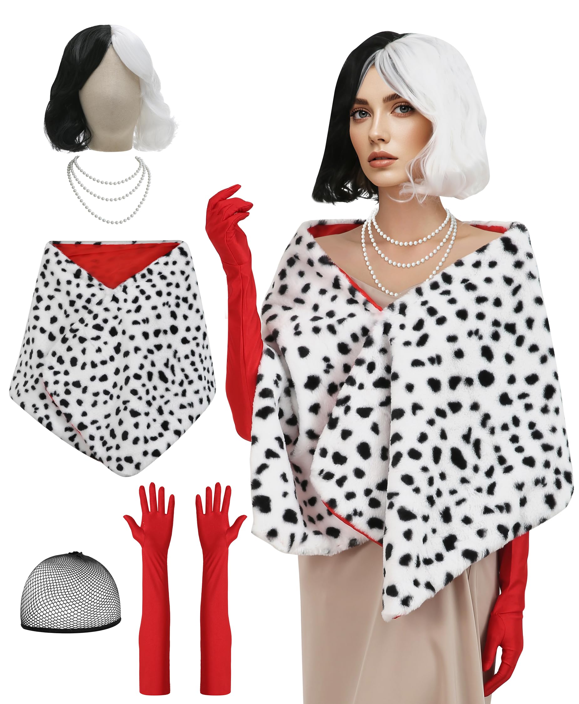 Halloween Costume for Women,Black and White Wig,Pearl Necklace,Dalmatian Shawl Scarf,Long Red Gloves Accessories