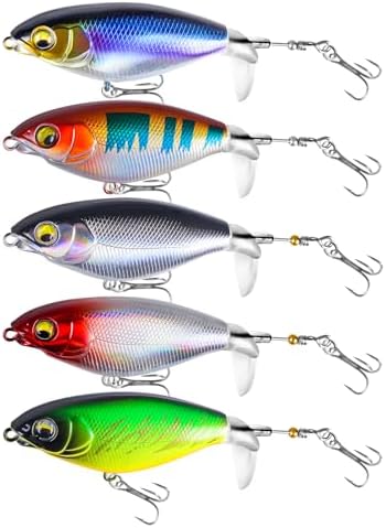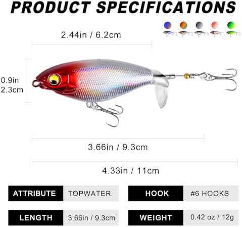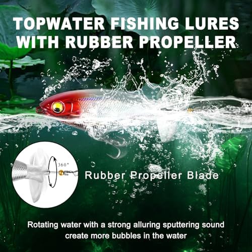 - 【EXCELLENT BODY DESIGN】Topwater fishing lures kit have a extra weight on the belly, control barycenter easily, can ensure the stable swim action, and make it do a farther casting distance effortlessly. When you rapid and steady retrieve the bait, the tail rubber propeller will be rotating, make splashed water and creates more bubbles in the water, making it even more attractive to bass. When the monster bass bites the fishing bait, its tail will close to prevent the bass from spitting it out.
