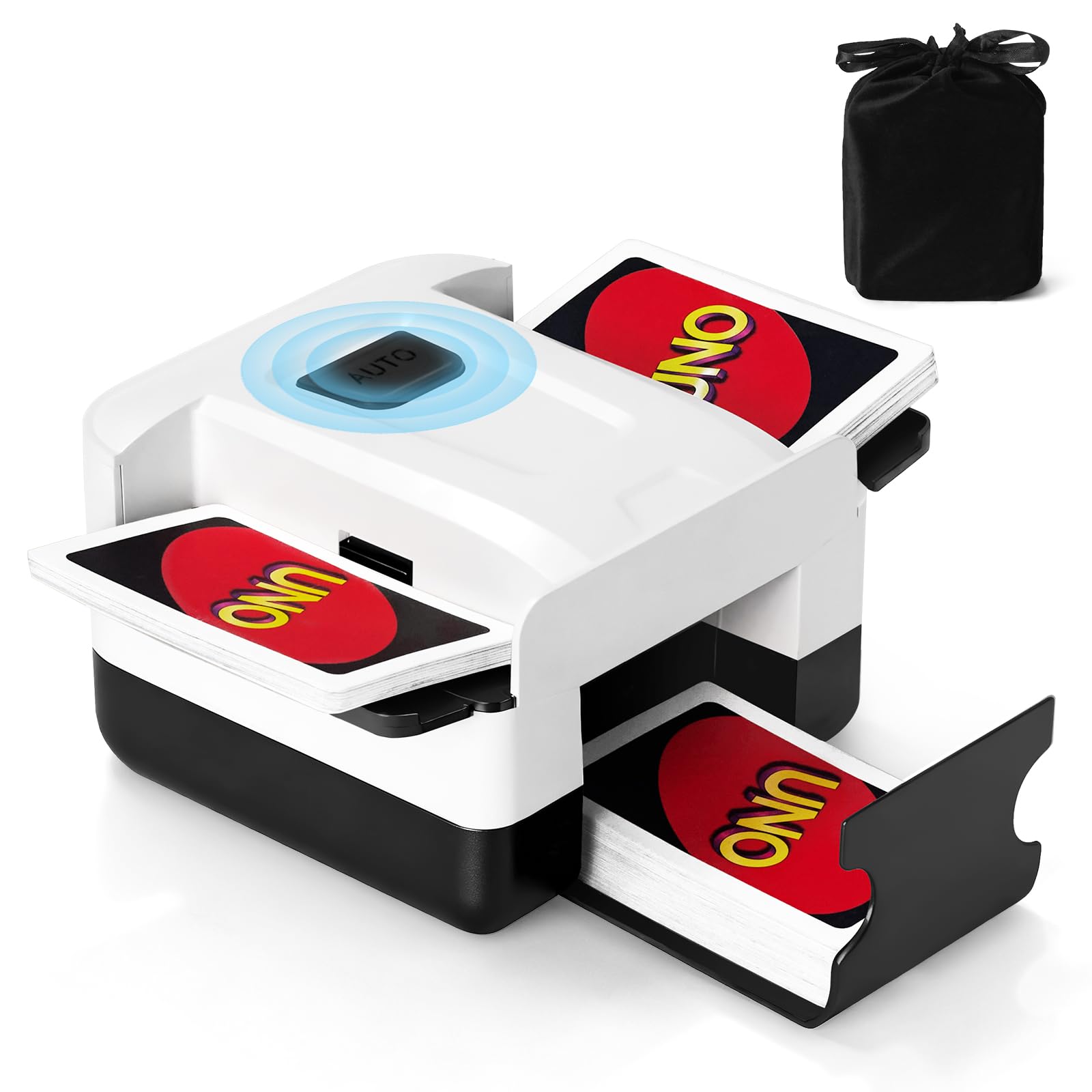 - Adaptable Card Sizes: Equipped with retractable wings, the ShuffleBox S1 can accommodate various card sizes, including Standard Poker and Bridge Card dimensions. It harmonizes with UNO, Taco Cat Goat Cheese Pizza, Five Crowns, Monopoly Deal, Mahjong, Taco vs Burrito, Exploding Kittens, as well as Maverick and Bicycle standard and jumbo size poker cards.