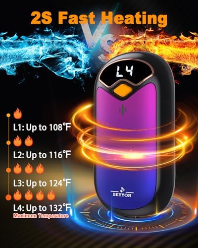 - 【2s Instant Heating】Say goodbye to cold fingers and long waits. Our electric hand warmer is equipped with an advanced chip control system that heats up in just 2 seconds. The reusable hand warmers are rechargeable and can be used again and again. With 4 heat-level settings, to ensures a stable, adjustable heating experience. It quickly dispels the cold so you can experience the therapeutic benefits of heat therapy. No more suffering of dysmenorrhea or stiff and numb fingers