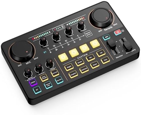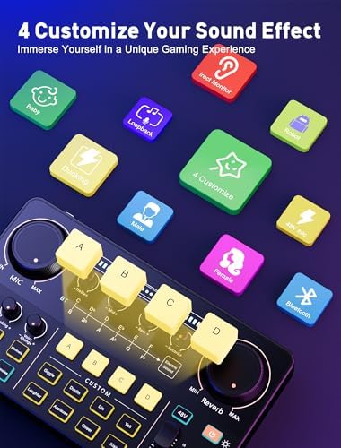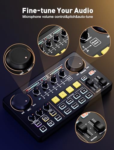 - 【Versatile Sound Customization】Featuring 4 customizable sound pads and 5 reverb modes, along with 12-step auto-tune and adjustable tones (Treble, Mid-range, Bass), this sound board allows for extensive personalization for all your audio needs. You can adjust the volume of each sound pad as well. Our digital audio controllers allow you to upload your favorite audio for podcast recording via smartphone, PC, microphone, or Bluetooth device.