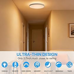 【Warm Tips】 LED flush mount ceiling light is NOT Battery Operated, NOT Rechargeable. The remote control should be aimed at the light when using, and the remote control distance is within 17ft. Ensure the light and remote are properly paired before use. 【2000K Night Light for Restful Evenings】A dedicated 2000K night light mode casts a gentle, amber-toned glow ideal for nighttime moments. Soft and non-intrusive, it provides subtle guidance without harsh glare, helping maintain a calm, sleep-friendly atmosphere. 【Customizable Color Temperature and Brightness】Using the included remote, effortlessly adjust the color temperature from 3000K warm white to 6500K cool white, offering a level of flexibility beyond traditional 3CCT or 5CCT fixed presets. Smooth, flicker-free dimming from 10% to 100% provides precise, effortless control—supporting both focused tasks and moments of relaxation. 【Intelligent Memory Function & 20-Second Auto-Off Timer】The light automatically remembers your last selected brightness and color temperature, whether turned off via the remote control or wall switch. When switched on again, it restores your preferred settings for a seamless, uninterrupted lighting experience. With the remote-activated 20-second auto-off timer, you can turn off the light and move safely or settle into bed before it shuts off—no walking in the dark. 【Safe & Long-Lasting Design】This 12 inch led flush mount ceiling light built with fire-resistant materials to support safe, stable operation. High-quality LEDs rated for up to 25,000 hours deliver consistent, eye-friendly lighting with reduced maintenance over time. 【Ultra-Thin Profile, Refined & Efficient Brightness】With a minimalist 0.7-inch ultra-thin design, this dimmable LED ceiling light blends elegantly into modern interiors. It delivers up to 2400 lumens of even illumination while using up to 80% less energy than traditional bulbs, maintaining a clean, unobtrusive presence with greater efficiency. 【Easy Installation】Designed for convenience, the lightweight fixture is compatible with most junction boxes and installs easily with included hardware. Clear instructions ensure a smooth setup—no professional assistance required.