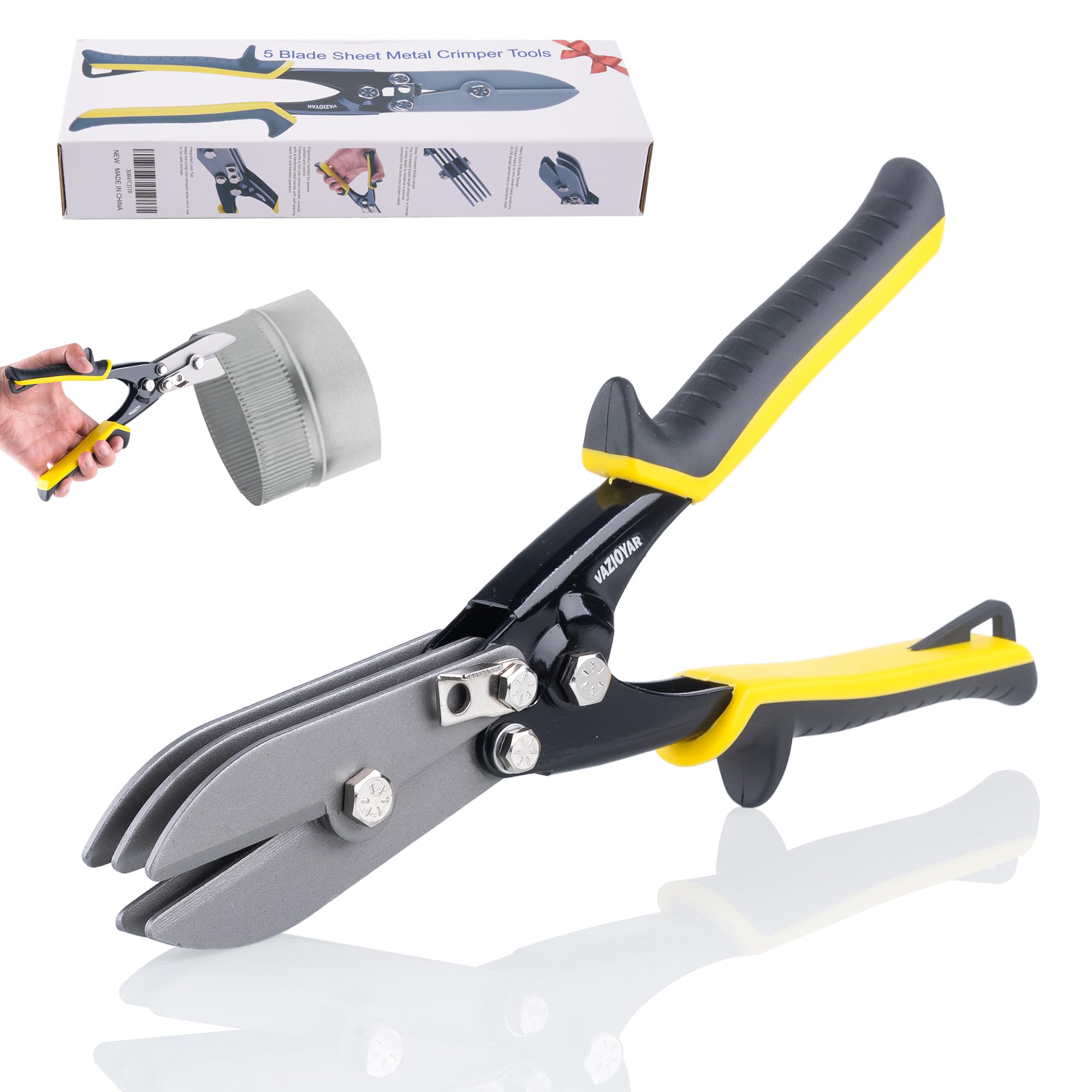 - Heavy Duty Material: 5-blade Sheet Metal Tools blades are made from hardened and tempered A3 tool steel; The main body and handles are made from tough, impact-resistant 50# steel plate and TPR rubber protection with strong wear resistance