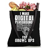"I make digital playgrounds for grown ups" Calling all Game Makers, Indie Devs, and Programmers. Embrace love for coding and game development with this humorous design. Perfect for those who loves programming. Perfect for the indie game developer who loves to code games and enjoys programming humor. This design is a witty nod to the world of video game development, showcasing your passion for video game development. 16” x 16” bag with two 14” long and 1” wide black cotton webbing strap handles. Made of a lightweight, spun polyester canvas-like fabric. All seams and stress points are double-stitched for durability, and the reinforced bottom flattens to fit more items and hold larger objects. Spot clean/dry clean only.