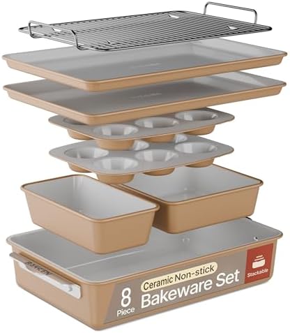 - Healthy Baking Made Simple: Experience guilt-free baking with our 8-piece stackable bakeware set, featuring a ceramic non-stick coating that’s free of PFOA, PFAS, and PTFE for a healthier cooking option.