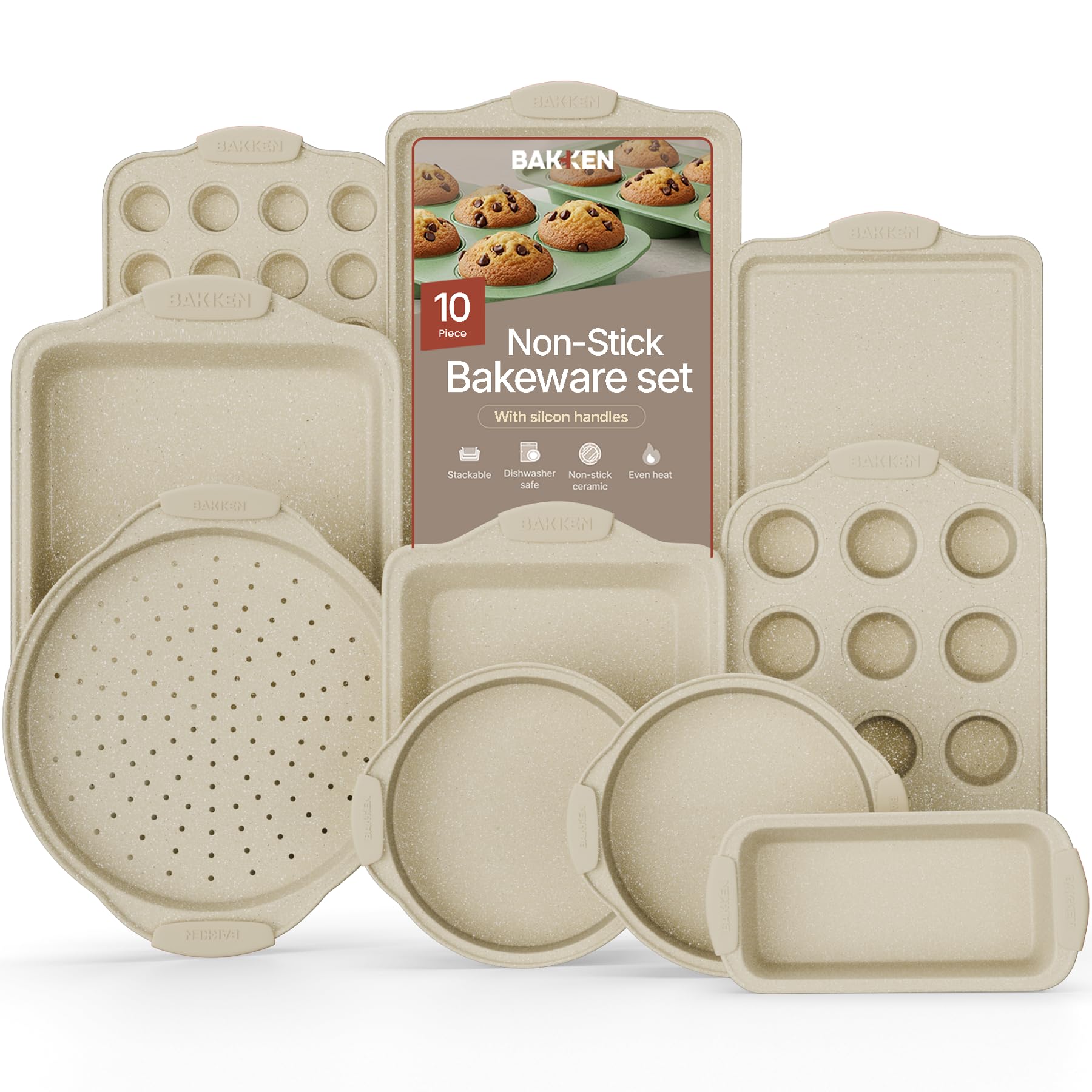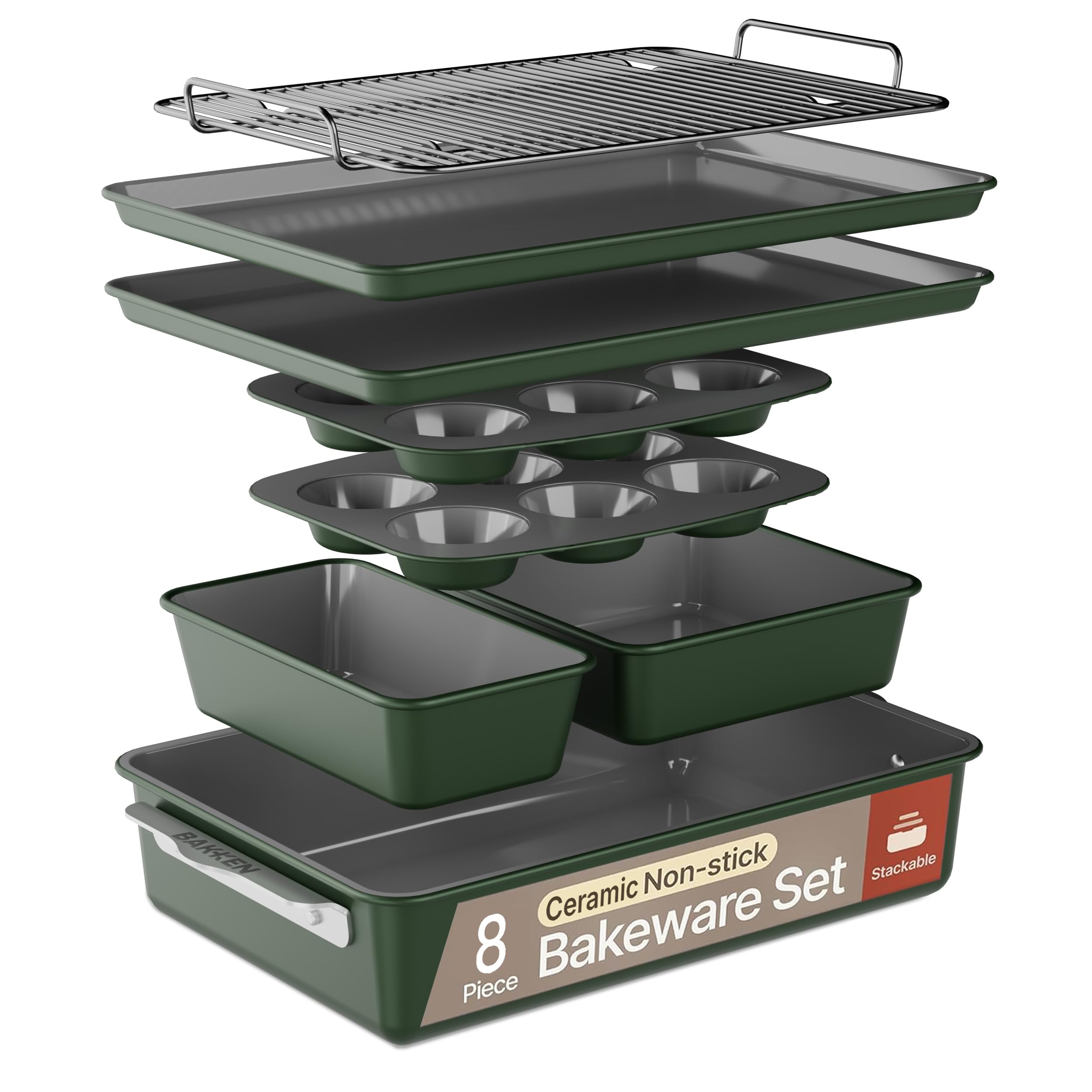 Bakken 8-Piece Stackable Bakeware Set – Ceramic Non-Stick, Oven-Safe Baking Sheets & Pans, PTFE/PFOA/PFOS-Free, Ergonomic Handles, Includes Cooling Rack – Healthy, Non-Toxic Baking Essentials