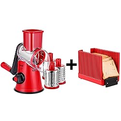 - Geedel Rotary Cheese Grater and Bread Slicer are the most reliable kitchen gadgets for you, you can get almost everything in these devices! Hand rotating and cutting to get everything done easily and safely, it's the fastest way to improve your health, get more energy with less calorie food and enjoy a healthier and easier life! ✅Both Cheese Grater and Bread Slicer are Easy Cleaning - The rotary grater and bread slicer are easy disassembling for speedy clean up, simply finish cleaning under running water in 2 minutes, also top dishwasher safe. ✅ Vegetable Grater and Bread Slicer are both made of food grade ABS matiral, NO BPA, which are safe to make recipes for your family and friends. ✅ Safe Operation - Never worry about touching blades with the grater while operating ever and the bread cutter provides a safely manner without exposing your fingers to knife injuries ✅ The cheese grater also features 3 interchangeable blades, to finish the slicing, shredding and fine shredding with ease. What's more, the cheese shredder cuts more efficiently, cutting 12 times faster than other conventional slicers. ✅ The bread slicer is ideal for bread, toast, bagel, loaf and sandwich, and more.Perfect for preparing your family's breakfast or baking with your friends and having fun! ✅The bundled cheese grater and bread slicer are both simple and easy to use and clean, you can save a lot of time preparing ingredients in the kitchen!