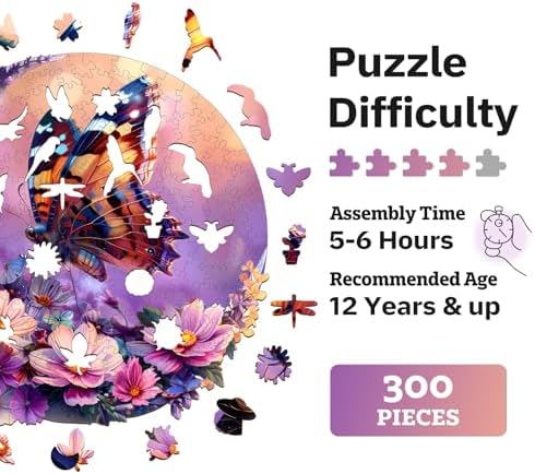 Jigfoxy Wooden Puzzles for Adults, Butterfly and Moon Wood Puzzles Adult, Unique Animal Shape Wooden Jigsaw Puzzles for Adults, Birthday Gifts for Puzzle Lovers, Family (L-13.4 * 13.4in-300pcs)