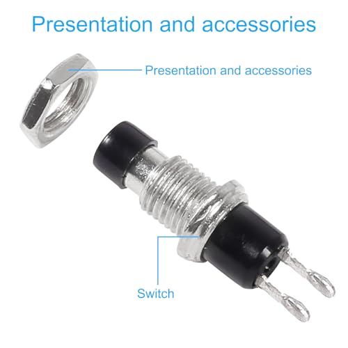 - PUSH BUTTON SWITCH: Poles : SPST; Rating Voltage : AC 250V / 1A; Terminals : 2 Pin; Hole Diameter: 7mm.