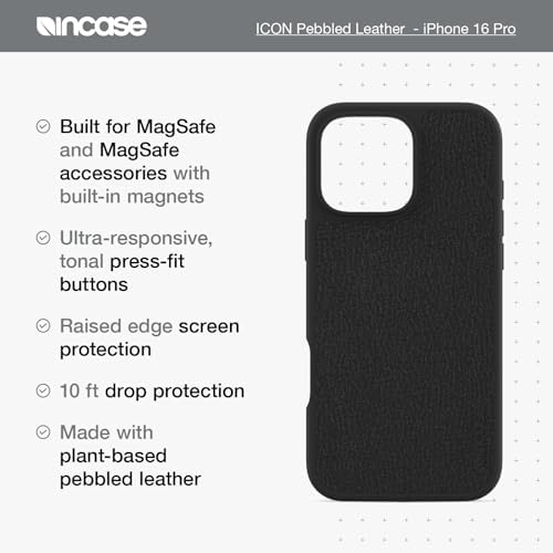Incase ICON Case with Woolenex for iPhone 16 Pro - Durable, Protective, Lightweight, Water-Resistant, Scratch Resistant with Wireless Magsafe Charging - Obsidian Pebbled Plant Leather