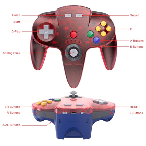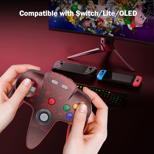 KIWITATA N64 Wireless Controller for Switch(1,2), 2.4GHZ Rechargeable N64 Remote Joystick Wireless Gamepad Controller Compatible with N64 System, Raspberry Pi, MAC,PC Windows 7,8,10,11 Clear Red