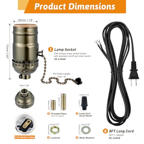 Lamp Repair Socket Kit,Pull chain ON/OFF switch Socket for DIY Lamp with 8 feet Matching Cord and Essential Hardware, Table Lamp Rewiring Kit for Vintage Lamps or DIY Lighting Fixtures (Antique Brass)