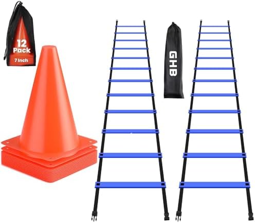 GHB Pro Agility Ladder 2 Pack and 7 Inch 12 Pack Soccer Cones 3 Carrying Bag