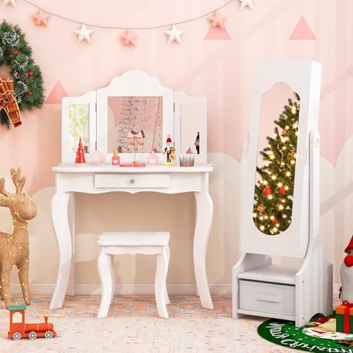 Costzon Kids Jewelry Armoire Cabinet, 41.5” Standing Jewelry Organizer with Full-Length Mirror, 3 Storage Drawers, Kids Vanity Dress Up Mirror Jewelry Cabinet for Little Girls (White)