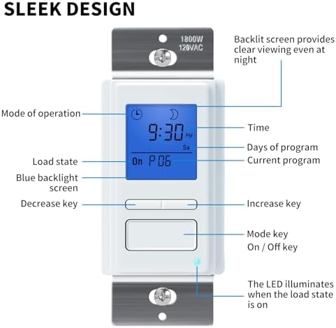 - SLEEK DESIGN: Flush with standard decorative wallplate and blend in with virtually any home interior. Featuring a LCD screen with easy-to-read blue backlit display, and a three-button interface for simple operation and programming