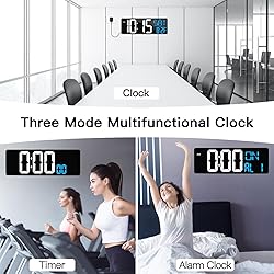 So Easy to Read — This large digital wall clock has a 17-inch HD LED screen and large 4.84-inch high-contrast digits that can be clearly read even from a distance and at various angles. Two colors, white + green, to distinguish the time/date and higher contrast make it more friendly to elderly people with degenerative eyesight and those with poor vision. Simple Setup+ Wireless Remote Control — Streamlined setup steps make this digital wall clock large display very easy to set up. It also comes with a wireless remote control with an effective distance of 32 feet. Even if the wall clock is on the wall, you can complete or update the clock settings via the remote control, which is very convenient for the elderly and people with limited mobility. Auto/Manual Brightness Adjustment — large digital clock has a built-in light sensor that automatically adjusts the brightness according to external light. It also has 4 brightness levels that can be manually adjusted to meet your brightness needs for different environments. And its screen can also be completely turned off, which is very friendly to those who seek a light-free sleep environment. Multifunctional + Multi-scene Use — It is not just a wall clock, but a multifunctional large wall clock digital that combines 3 functions: digital wall clock, digital alarm clock and large digital timer. Just press the mode button, you can switch between the three modes, our clock is powerful and easy to operate. It is very suitable for living room, kitchen, garage, office, warehouse, classroom, gymnasium. Easy to Use + Memory Function — You only need to use our complimentary power adapter and power cord to make the wall digital clock large display work (rechargeable/battery operated is not supported). Built-in 2*AAA batteries (included) are used for its activation memory function, which automatically saves the time and alarm settings even if the power goes out unexpectedly.