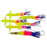 - (5) In-Line, 5″ Free Spinning Skirted Chatter Birds Hidden AFW #350 Ball Bearing Snap Swivel in the last teaser bird 12″ Machine Stinger with 9/0 Koga Hook Rigged on #250 Momoi Smoke Blue Mono Comes with 11″ x 11″ Mesh Lure Bag