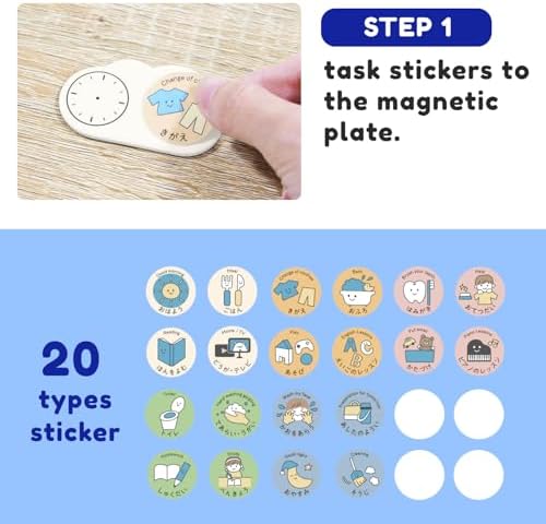 - Stickers of tasks are attached to cloud-shaped magnets (preparation plates), and time can be written on them. The set includes 12 preparation plates, 20 different task stickers, and blank stickers wher
