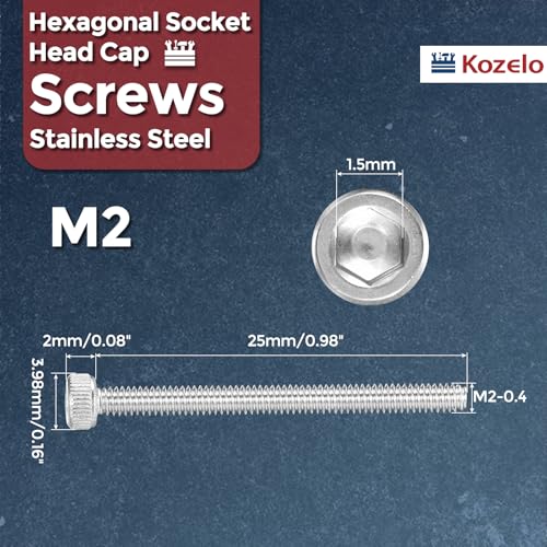 1- PACKAGE CONTENTS - 40pcs of hex head socket head cap screws, Thread Size: M2-0.4; Thread Length: 25mm/0.98"; Head Diameter: 3.98mm/0.16"; Head Thickness: 2mm/0.08"; Hexagon Width: 1.5mm; They are a versatile and reliable choice for a wide range of industrial and commercial applications.