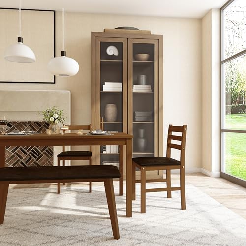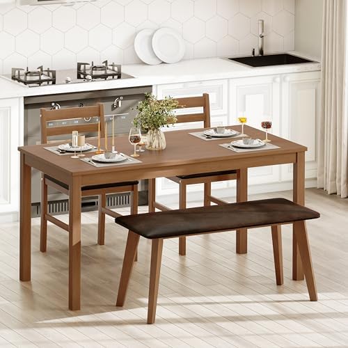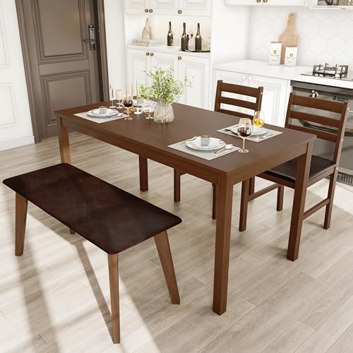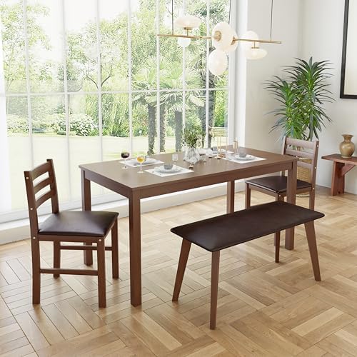 4-Piece Solid Wood Indoor Modern Rectangular Dining Table Set for 4 with Chairs and Bench,Table and Chairs Set with PU Leather Cushion for Kitchen,Bar,Living Room,Breakfast Nook,Brown