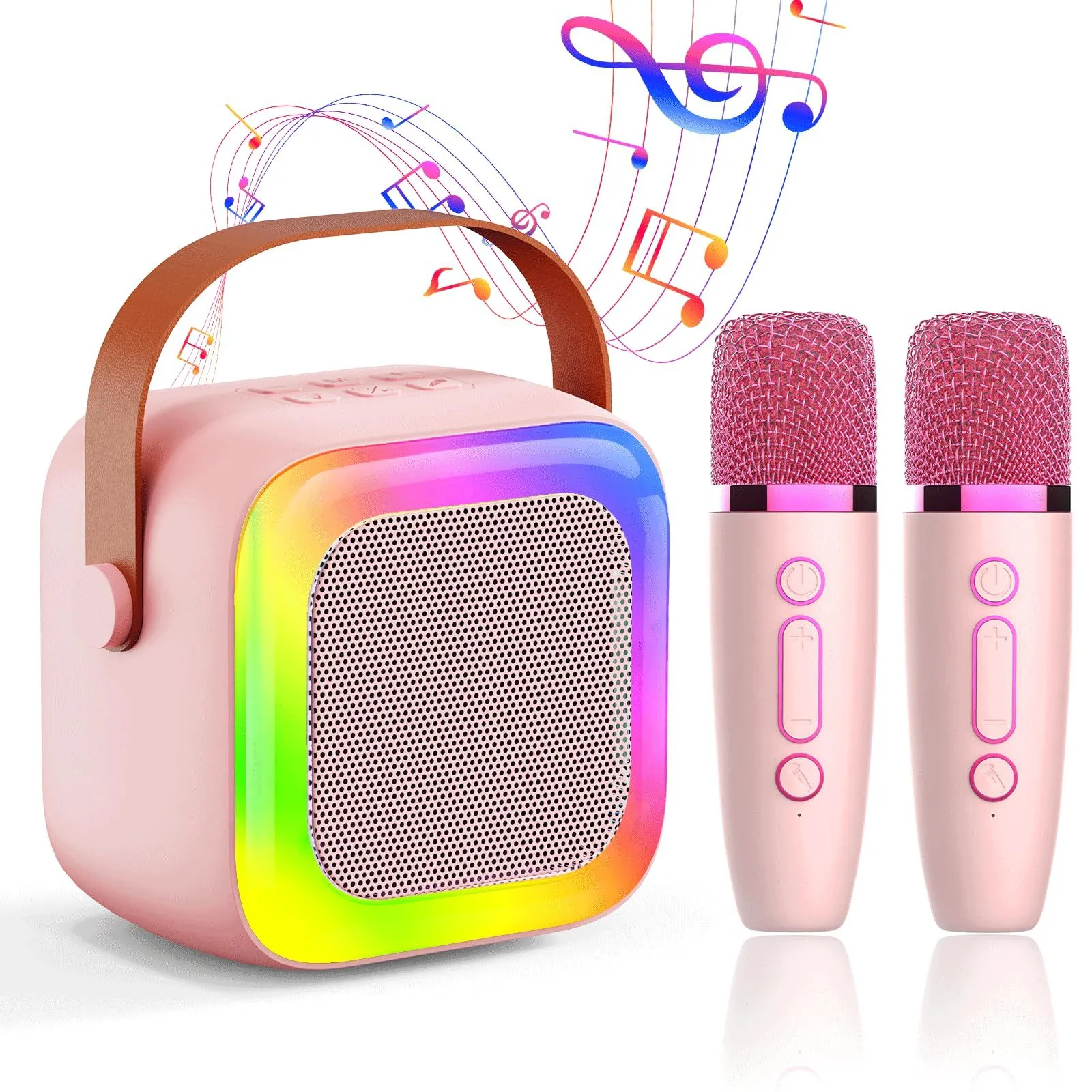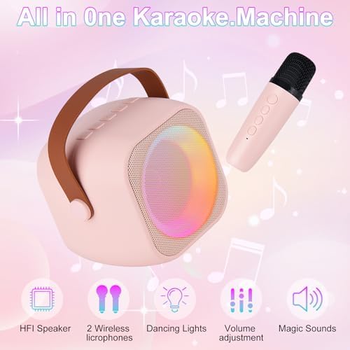 Karaoke Machine for Kids Adults, Mini Portable Bluetooth Karaoke Speaker with 2 Wireless Microphone and Lights,Toys for All Smartphones,Birthday, Family,Home Party Pinkcolor