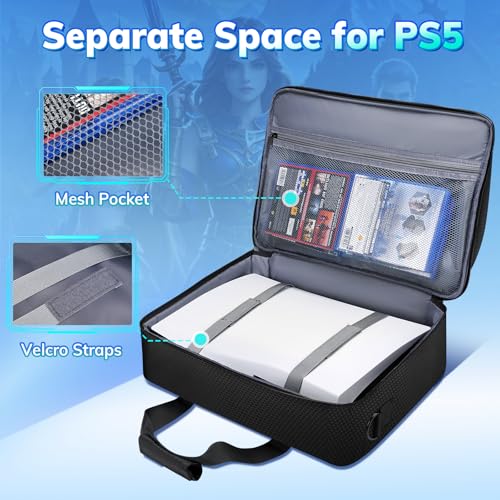 - Compatible for PS5 Consoles: Measuring 17 * 12 * 7.5 inches, the carrying case is compatible for PS5/PS5 Pro Slim console and accessories. The main compartment comes with a fixed strap to secure your console in place, keeping everything neatly organized and easily accessible