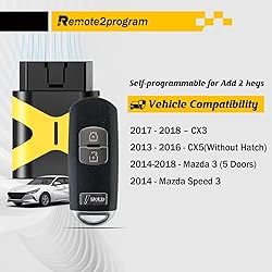 - **No Working Key? Need to program the key? **Our Kit uses state-of-the-art technology and is the first one on the market capable of programming smart keys. You just program it at home though you don't have one working remote, It can add 2 keys within 5-10 min, skip the locksmith and dealer, and get new key without paying expensive fees. Paired with keys to give you more peace of mind. Act quickly!!!!NOTE: 1. Before you buy it, Please make sure that your original FCC and Buttons are the same as our product in case of money lose. 2. After programming the new remote control, it needs to be held close to the startup slot for more than ten seconds.This remote is replacememnt for FCC ID: WAZSKE13D01 Frequency: 315MHZ Part #: KDY3-67-5DYCompatibility :For 2017 - 2018 –CX3 For 2013 - 2016 -CX5(Without Hatch) For 2014-2018 - Mazda 3 (5 Doors) For 2014 - Mazda Speed 3Disclaimer: Remote2program device is only used by car owners to program their own vehicles, and other actions are not affiliated with Remote2program