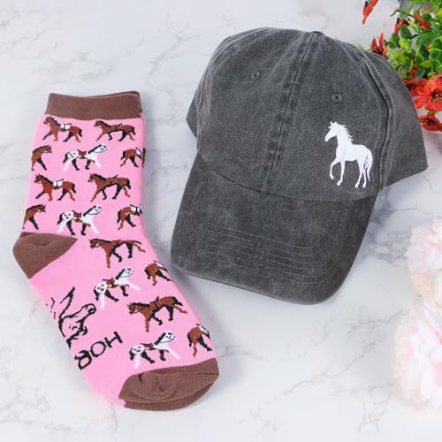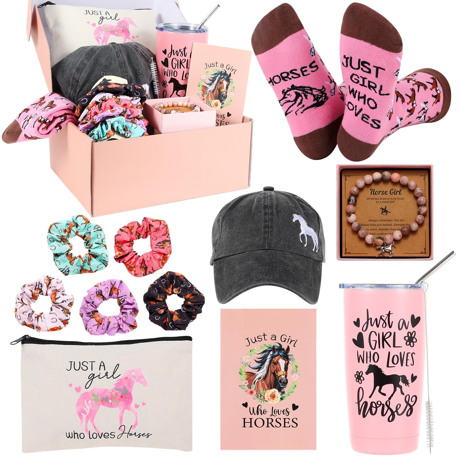 - Complete Horse Gift Set: This gift set features 8 different horse gift, including 20 oz tumbler mug, makeup bag, baseball hat, bracelet, hair tie, socks, gift card and gift box. This is a great horse gift!