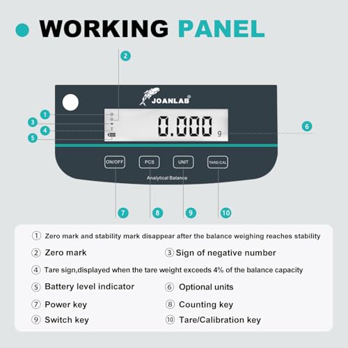 - 【FEATURES&DESIGN】The innovative dual-display design allows for easy reading in both the front and rear positions of the balance.With built-in power saving mode,JOANLAB laboratory analytical balance can set the automatic screen off time, energy saving and evironmental protection.