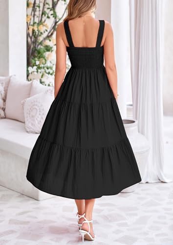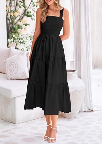 PRETTYGARDEN Womens Smocked Midi Dress 2025 Summer Ruffle A Line Long Flowy Dresses Cute Sleeveless Beach Sundress (Black,Medium)